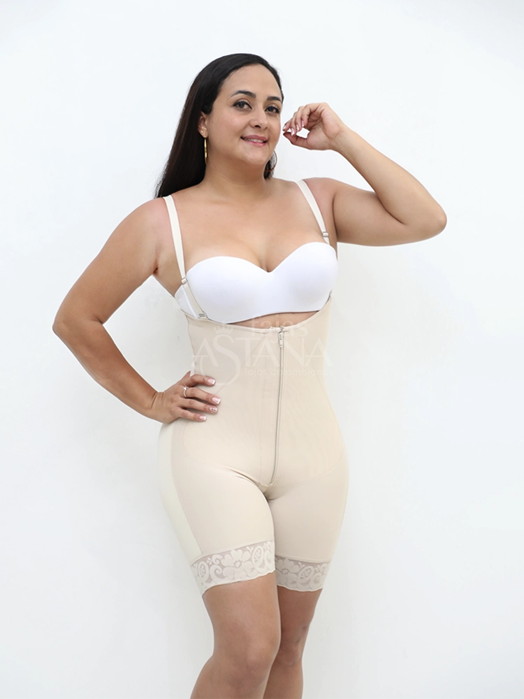 Faja corta strapless, cierre/zipper con broches internos, huecos internos, forro en lycra y cierre perineal.